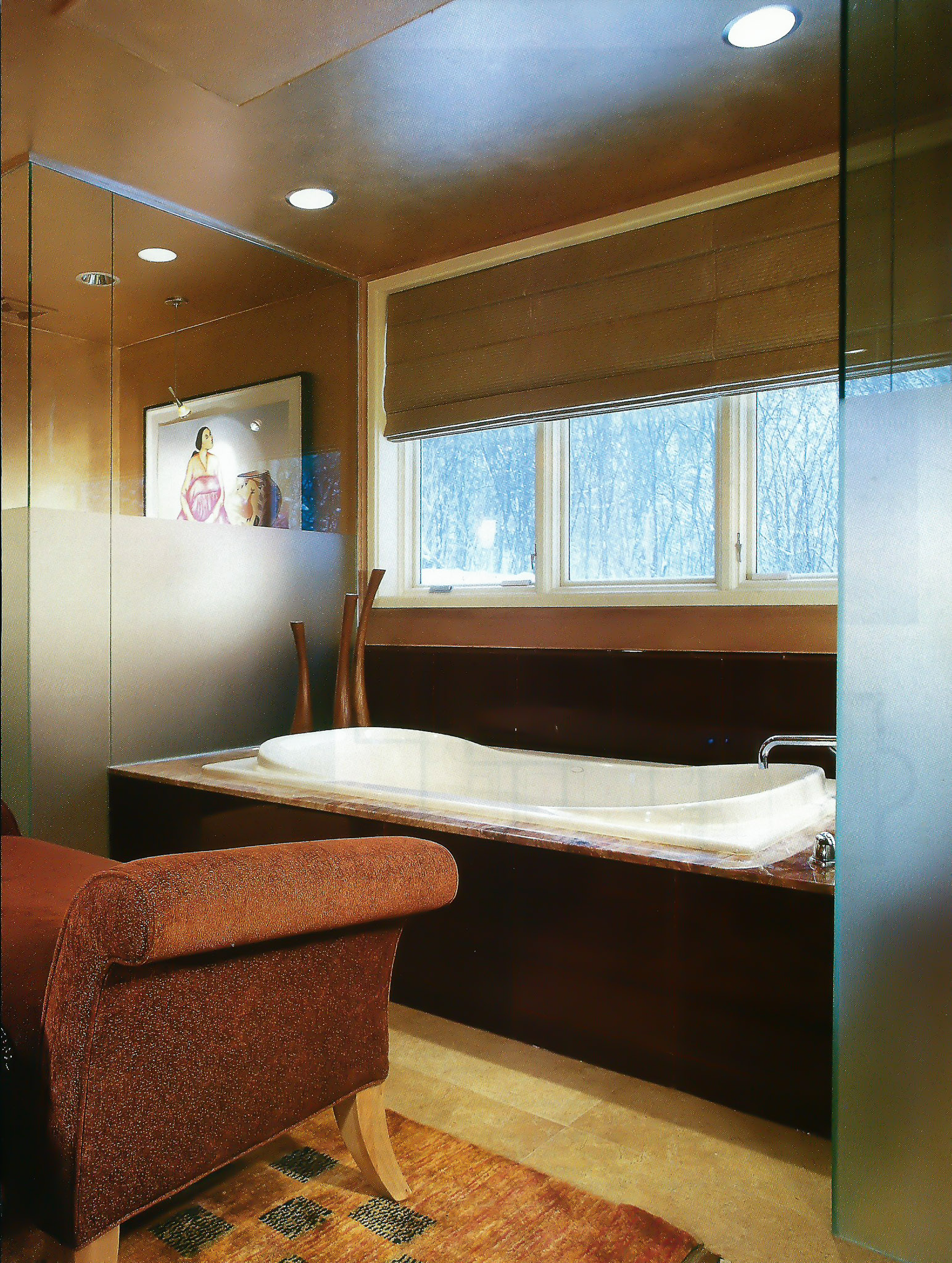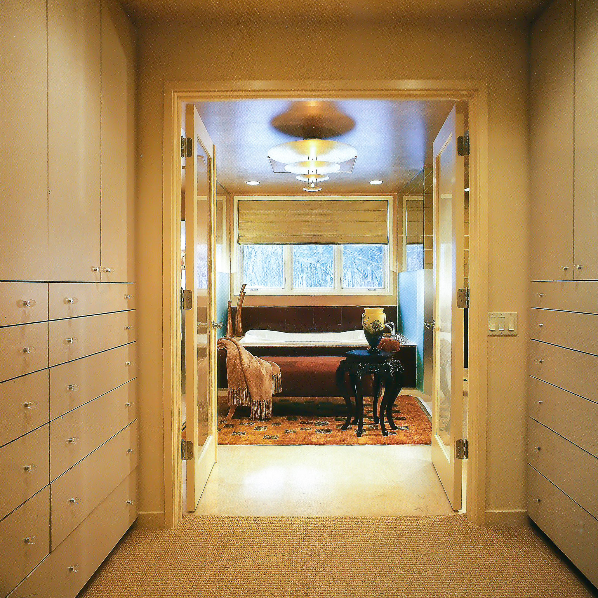 The clients originally built this custom home in 1980 in the Chicago suburb of Highland Park. Several decades later I was hired to enlarge and refresh the home. The enlarged Master Suite with bedroom, bath and dressing rooms, and home office was featured in Trends Magazine‘s “Best Of Trends – Private Retreat” vol 2015.