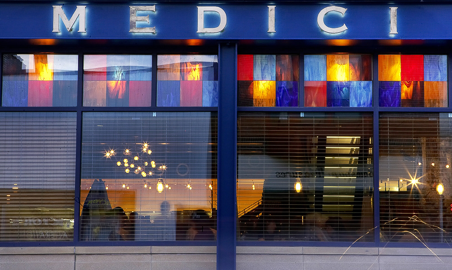 The Medici Restaurant is a very successful establishment in the college town of Normal, IL. The project architecture and interior designs were executed by Josh Behr and include new construction in an historic preservation district encompassing a bakery, two bars, indoor and outdoor dining, and banquet facilities. The two facades are recreations from photographs obtained from the local historical society. The modern and eclectic interior has a variety of spaces with differing atmospheres. All of the wood furniture was made on the owner’s tree farm in Wisconsin by Amish craftsman. The tables are particularly noteworthy.