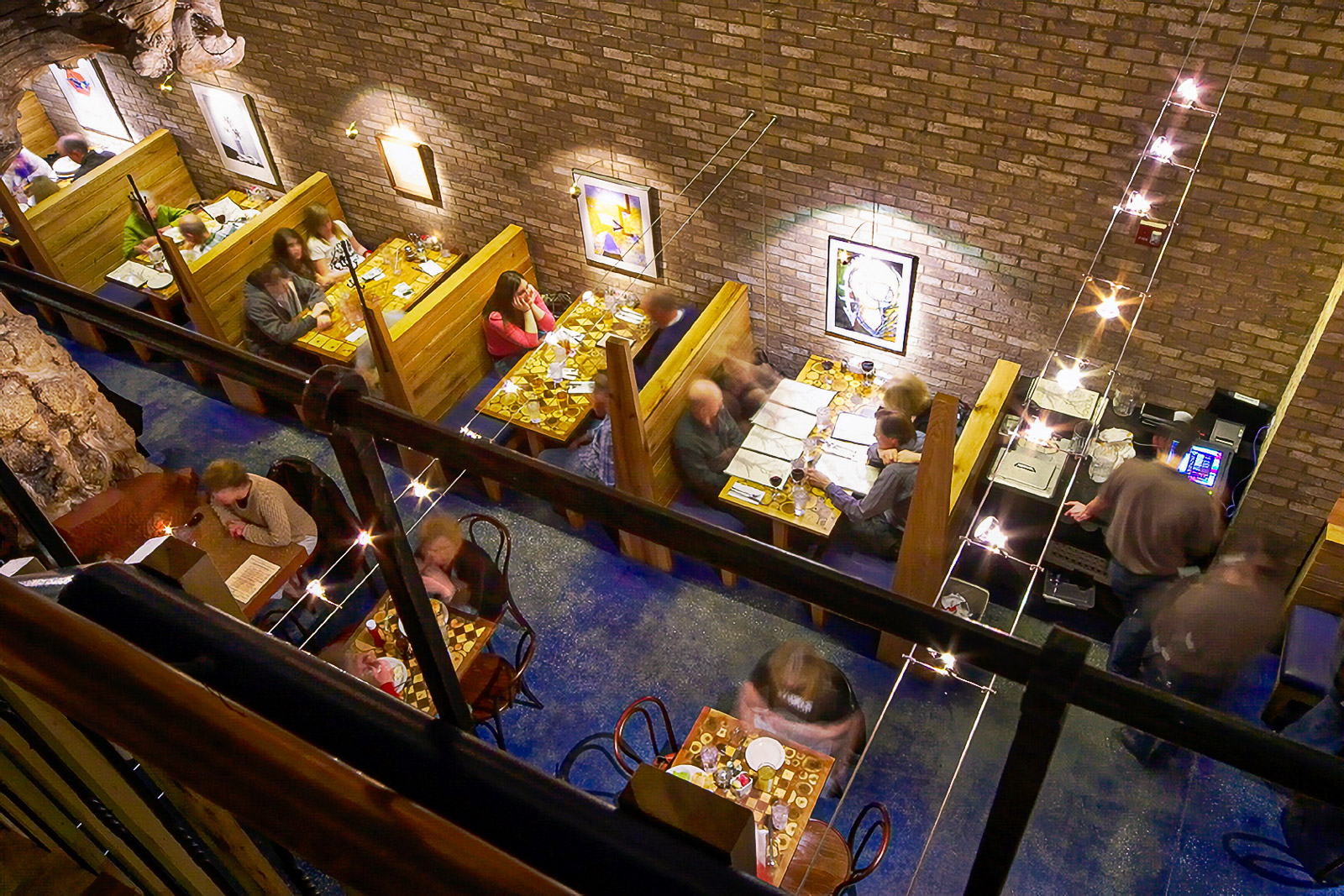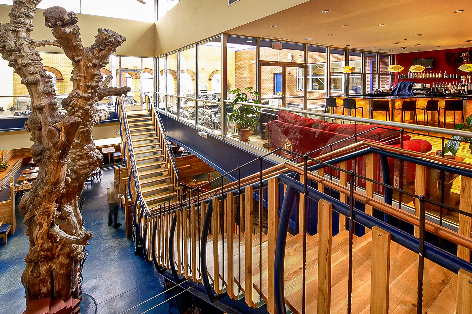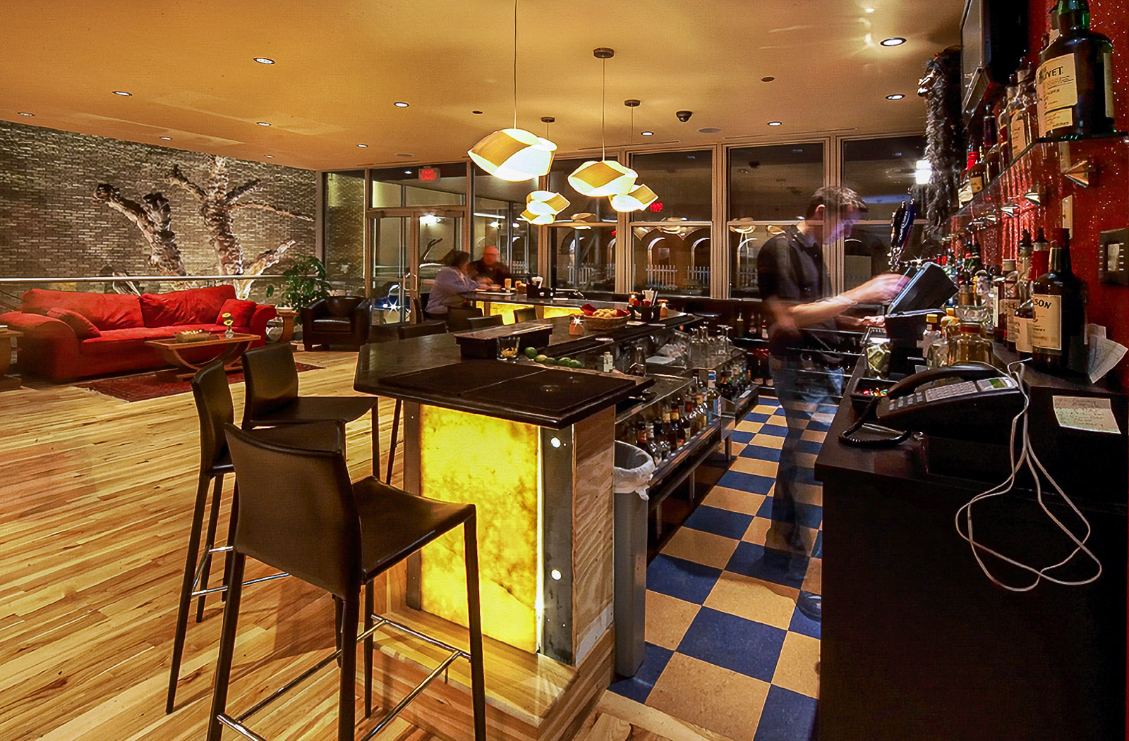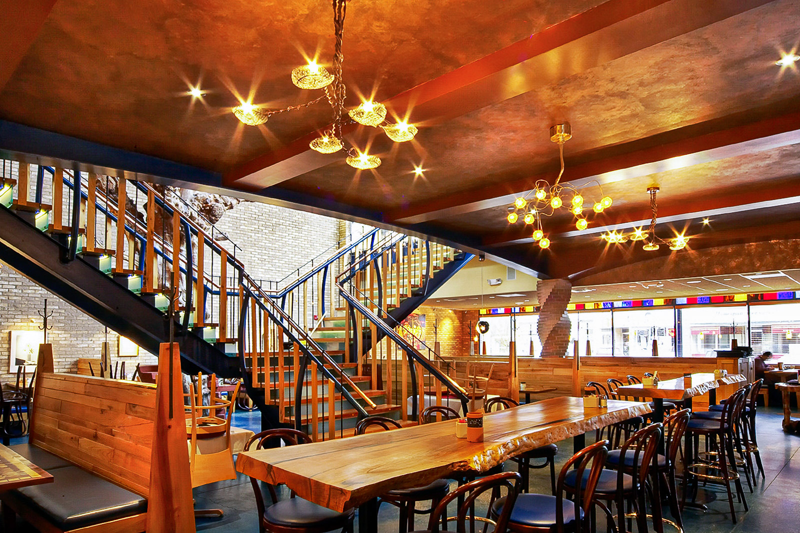 The Medici Restaurant is a very successful establishment in the college town of Normal, IL. The project architecture and interior designs were executed by Josh Behr and include new construction in an historic preservation district encompassing a bakery, two bars, indoor and outdoor dining, and banquet facilities. The two facades are recreations from photographs obtained from the local historical society. The modern and eclectic interior has a variety of spaces with differing atmospheres. All of the wood furniture was made on the owner’s tree farm in Wisconsin by Amish craftsman. The tables are particularly noteworthy.